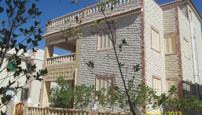 جميع الشاليهات بالقرية ذات تصميم موحد ومغلفه بالخارج من الحجر الفرعونى والحرارى