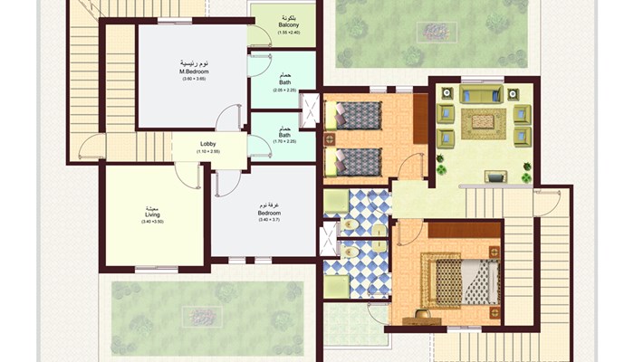 محتويات الدور الأرضي: جنينة وتراس - غرفة معيشة وغرفة طعام - مطبخ وحمام