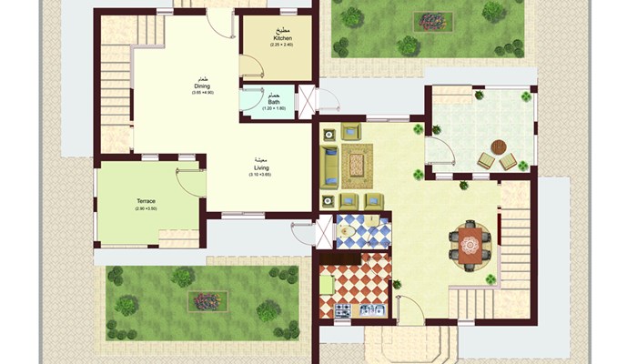 محتويات الدور الأرضي: جنينة وتراس - غرفة معيشة وغرفة طعام - مطبخ وحمام