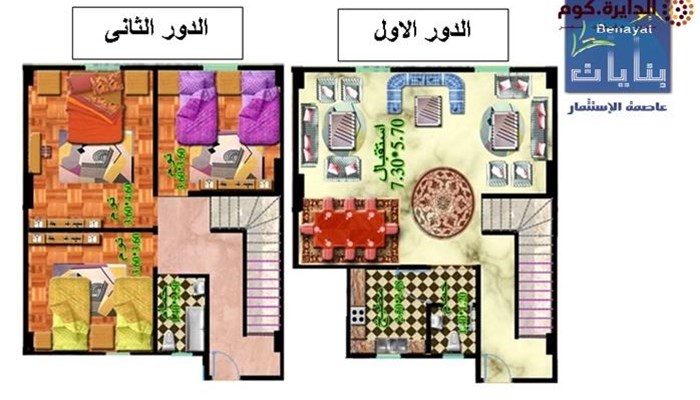 الدور الثاني مكون من ثلاث غرف وحمام - يوجد سلم داخلي يربط الدورين ببعض